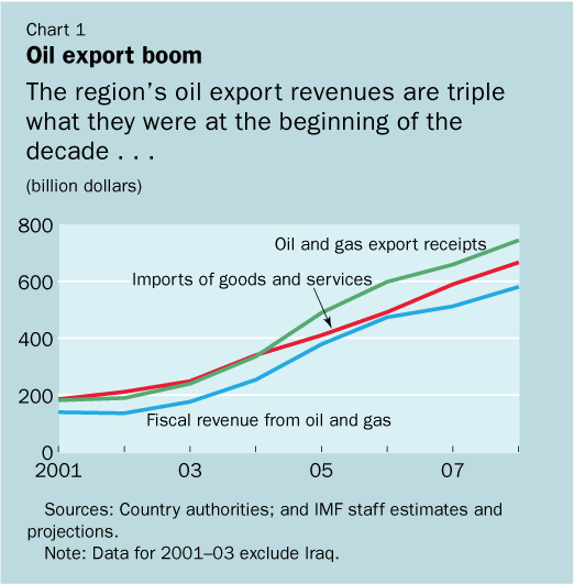 The dramatic increase in world oil prices has resulted in a boom in Middle East and Central Asian oil-exporting countries' receipts for oil and gas exports.
