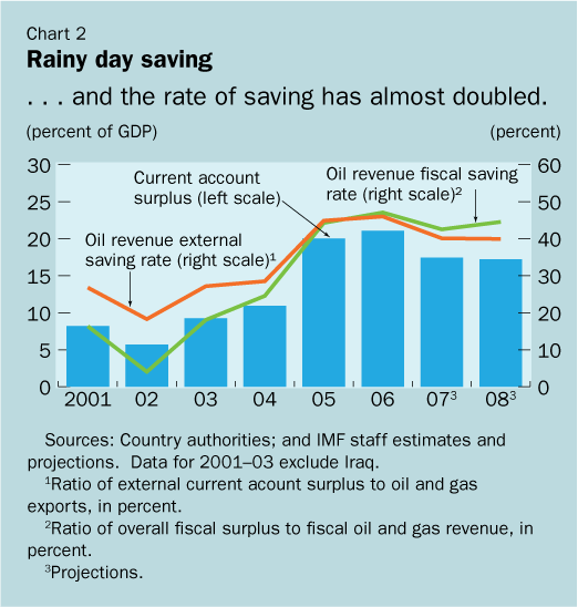 In other words, Middle Eastern and Central Asian oil-exporting countries, in aggregate terms, will be able to undertake their envisaged spending plans and still set aside substantial savings for the future.