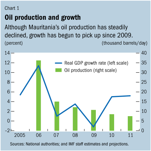 The North African country, one of the continent’s poorest, had high hopes for a dramatic change of fortune when oil was discovered off its shores in 2001. Production in Chinguetti, the main oil field, started in 2006 and immediately ran into major technical difficulties, which led output to fall from close to 75,000 barrels per day (bpd) in early 2006 to 23,000 by end-2006. Since then, oil production has steadily declined, with output projected to be as low as 7,000 bpd in 2011 (see Chart 1).