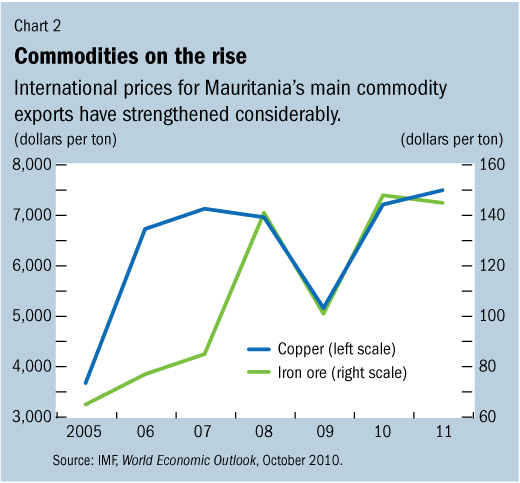 Today, the Mauritanian authorities have made good progress in reestablishing macroeconomic stability. Inflation is projected to remain in the single digits, while rapid credit growth, a strong pickup in exports, and a rebound in industrial production point to robust growth in the non-oil sector. Non-oil real GDP is expected to grow by 5.6 percent in 2010 and 5.5 percent in 2011, supported by strong activity in the agriculture, mining, and construction sectors. Thanks to higher prices and production levels of Mauritania’s iron ore, gold, and copper exports, the fiscal and external positions could improve (see Chart 2).