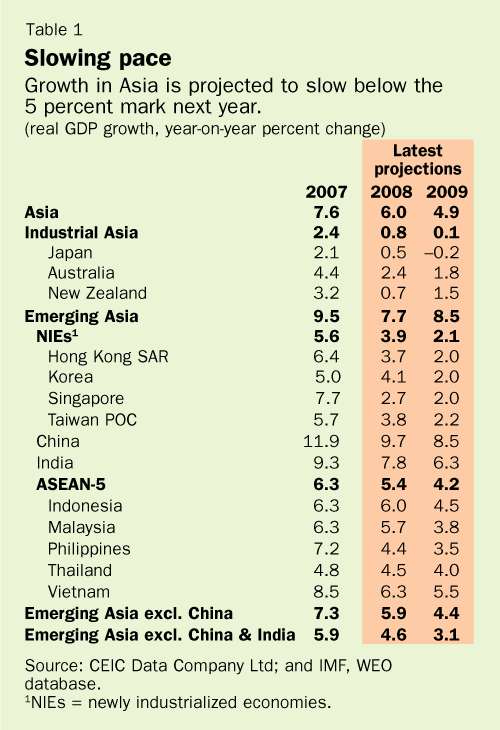 On an annual average basis, growth in Asia is projected to slow from 7.6 percent in 2007 to 6.0 percent this year and 4.9 percent in 2009, according to the IMF's Regional Economic Outlook for Asia and Pacific, which was released on November 24 (see Table 1).