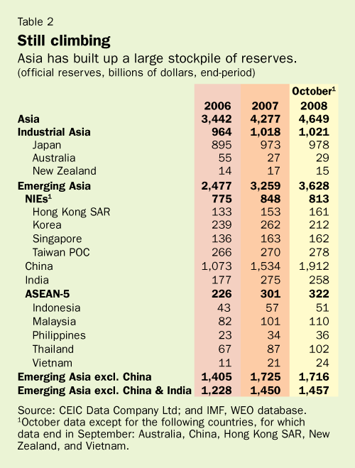It also remains unclear how domestic demand in the region would stand up to a sharp decline in export growth and tighter financial conditions, the report said. Despite Asia's generally strong fundamentals, and large foreign exchange reserves (see Table 2), the region is "being rattled by the crisis due to its close trade and financial integration with the rest of the world."