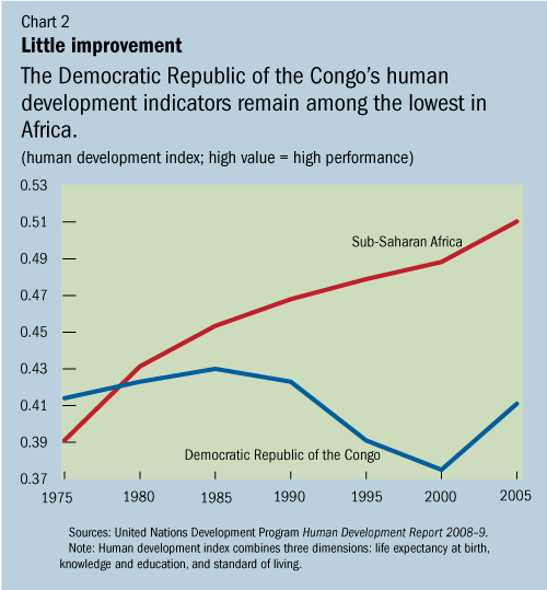 In spite of this progress, the country’s per capita income and human development indicators remain among the lowest in Africa (see Chart 2) and the insufficient domestic revenue mobilization effort, high external debt burden, and unsettled security situation in the eastern provinces continue to hamper post-conflict reconstruction, particularly regarding the rehabilitation of the country’s dilapidated physical infrastructure. The onset of the global financial crisis has further aggravated the situation by slowing down economic activity.