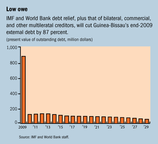 Debt relief from the IMF and the World Bank totals $15 million and $347.2 million, respectively, with the remaining relief expected to come from bilateral, commercial, and other multilateral creditors. As a result, the present value of Guinea-Bissau’s external debt at end-2009 will be reduced by 87 percent (see chart).