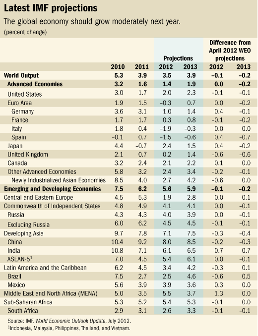 The latest World Economic Outlook projects that the global economy will grow 3.5 percent this year, down 0.1 percentage points from the April forecast, and 3.9 percent in 2013, 0.2 percentage points lower (see table).