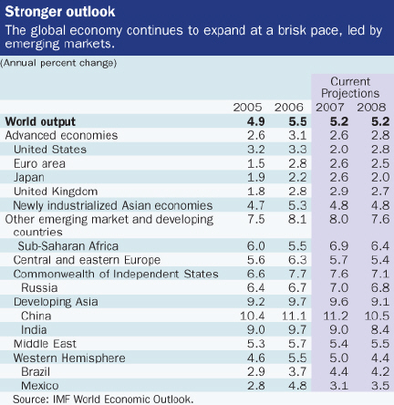 Against this background, global growth is now projected at 5.2 percent in 2007 and 2008—0.3 percentage points higher for both years than projected at the time of the April 2007 World Economic Outlook (see table).