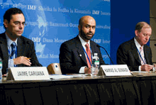 IWG co-Chair Jaime Caruana ( l ), drafting Chair David Murray ( r ) at news conference with co-Chair Hamad Al Suwaidi: "It's all about trust" (IMF photo)