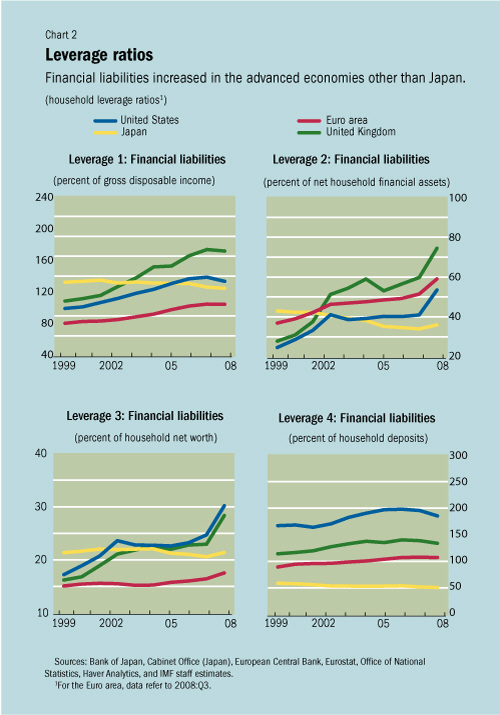 But the leverage ratios also indicate substantial differences across countries. For instance, although household financial liabilities relative to net worth remained broadly unchanged in Japan and rose moderately in the euro area, they increased substantially in the United Kingdom and the United States—from about 17 percent of net worth in 1999 to more than 28 percent at end-2008.