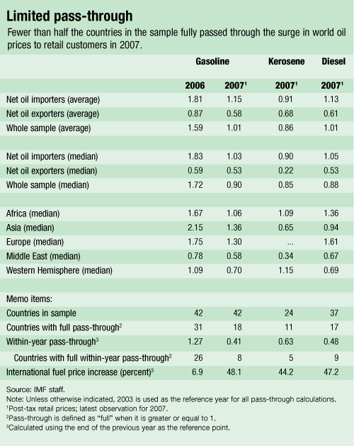Less than half of a sample of 42 developing and emerging market countries fully passed through sharply higher world oil prices to retail customers in 2007.