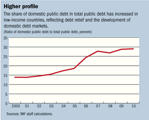 Strengthening the analysis of total public debt and fiscal vulnerabilities. Analyses of debt sustainability have traditionally focused on external public debt. Although external public debt remains the largest component of debt in most low-income countries, the share of domestic public debt in total public debt has increased, reflecting debt relief and the development of domestic debt markets (see chart). In some countries, the level of domestic debt to GDP is substantial, or is growing rapidly. In this context, the DSF will need to pay closer attention to the risks associated with total public debt, both external and domestic. Henceforth, the framework will include benchmarks for total public debt that will be used to determine when deeper analysis should be conducted.