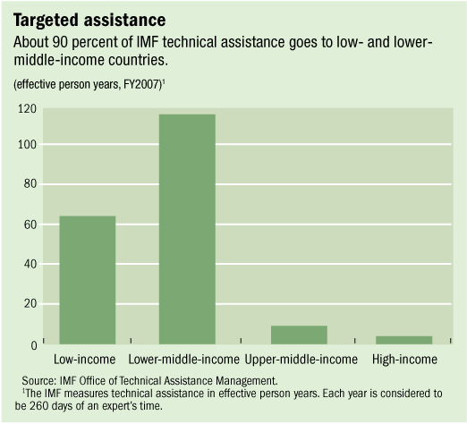 A key benefit of IMF membership, technical assistance—over 80 percent of which goes to low- and lower-middle-income countries (see chart)—is aimed at building the institutions and skills needed by countries to design and implement macroeconomic policies that promote growth. To ensure strong country ownership, IMF technical assistance is designed and delivered within the context of each recipient country's economic reform strategy and priorities.