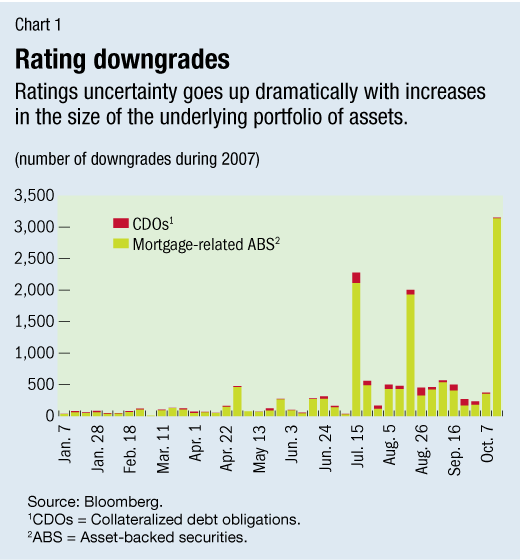 The uncertainty about ratings was a result of multiple-notch downgrades of mortgage-related securities (ABS and CDOs) that occurred en masse. On average, during 2007, the agencies downgraded structured securities by 3-4 notches. A four notch downgrade is, for example, from AAA to A+. More than 3,000 downgrades occurred in October 2007 alone.