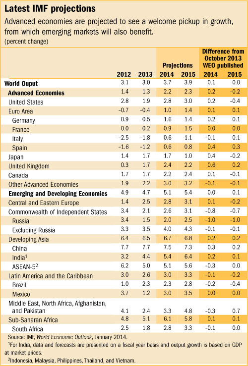 Global growth is expected to increase in 2014 after having been stuck in low gear in 2013, says the IMF’s latest World Economic Outlook (WEO) Update. The IMF forecasts global growth to average 3.7 percent in 2014―up from 3 percent in 2013―and to rise to 3.9 percent in 2015.