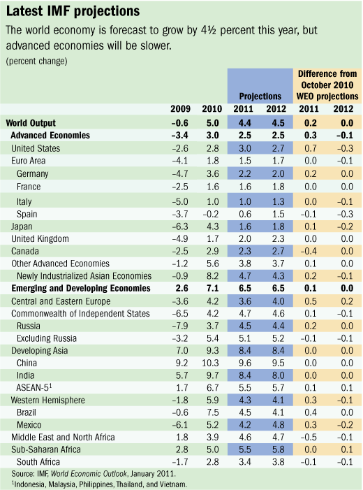 Overall, advanced economies are projected to grow by 2.5 percent in 2011, with emerging and developing economies seeing growth of 6.5 percent, against 7.1 percent last year. Growth in sub-Saharan Africa will climb to 5.5 percent, from 5.0 percent in 2010.