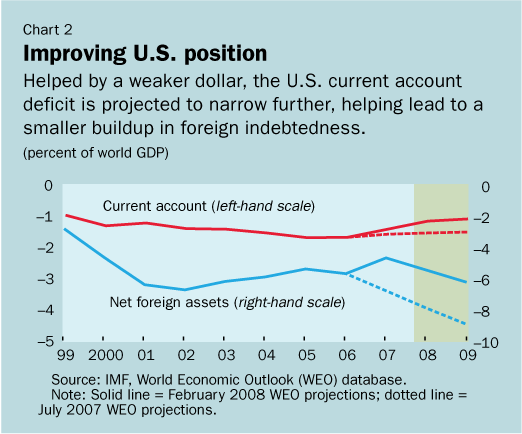 With a slowing economy and a weaker dollar, the U.S. current account deficit has narrowed faster than expected (to about 5½ percent of GDP in 2007). Moreover, current projections for the deficit are markedly lower compared with projections when the consultations were under way (see Chart 1).