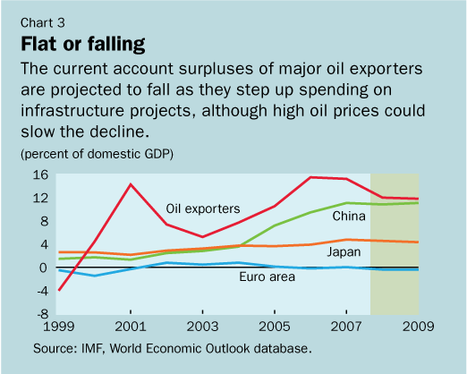 • Volatile oil prices—touching new highs amid tight market conditions—could slow a narrowing of global imbalances, given still-strong demand from emerging markets and ongoing concerns over supply. Oil price spikes could add to the imbalance problem by leading to wider deficits for importers such as the United States and larger surpluses for oil exporters such as Saudi Arabia (see Chart 3).