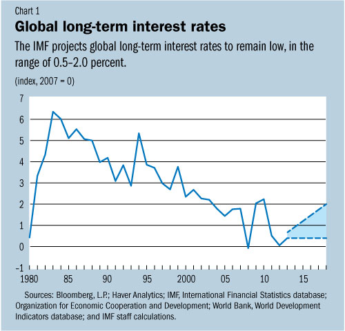 Since the early 1980s, interest rates, or yields, on assets of all maturities have declined worldwide, well beyond the decline in inflation expectations. This means that real interest rates—the rates paid by borrowers corrected for expected inflation—have declined. Ten-year real interest rates across countries fell from an average of 5½ percent in the 1980s to 3½ percent in the 1990s, 2 percent over 2001–08, and 0.33 percent between 2008 and 2012 (Chart 1).