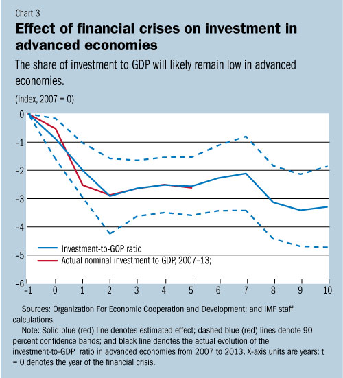 Scars from the global financial crisis resulted in a sharp and persistent decline in investment in advanced economies. This too contributed significantly to the recent decline in interest rates. The effects of the crisis on saving have been more muted. Our study finds that the effects of the global financial crisis will likely persist over the next 5 years, with investment-GDP ratios in many advanced economies unlikely to shift back to precrisis levels (Chart 3).