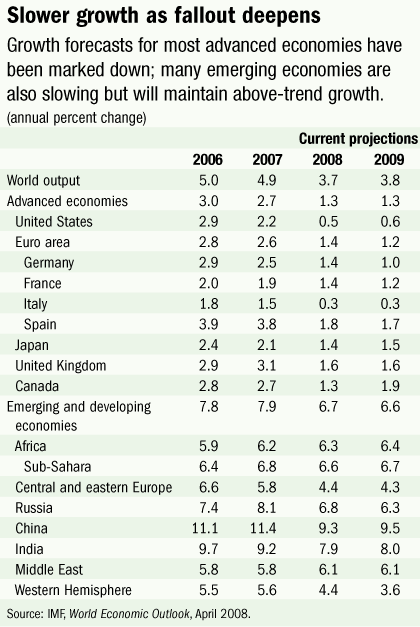 Citing the unfolding financial market turmoil as the biggest downside risk to the global economy, the April 2008 report said the IMF expects world growth to slow to 3.7 percent in 2008—0.5 percentage point lower than what was forecast in the January 2008 World Economic Outlook Update.