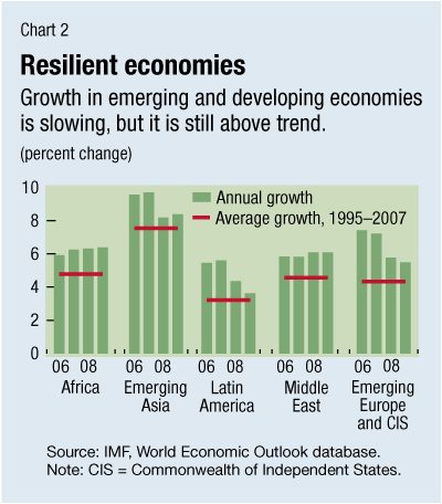 By contrast, the rapidly globalizing emerging economies have so far been less affected by financial market turbulence and have continued to grow at a rapid pace, led by India and China, although economic activity is beginning to moderate in some countries. Nevertheless, according to the IMF, growth across all emerging and developing regions will remain above trend (see Chart 2).