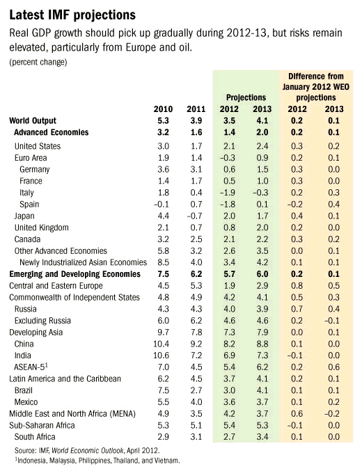 Overall, global growth is projected to drop from close to 4 percent in 2011 to about 3½ percent this year, picking up to 4.1 percent next year, the IMF said in its April 2012 World Economic Outlook, released on April 17 ahead of the Spring Meetings of the IMF and the World Bank in Washington.