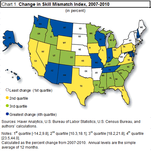 Nevertheless, using these broad categories to equate educational attainment with skills, Marcello Estevão and Evridiki Tsounta measure the mismatch in each U.S. state between the demand for workers of various skills and the supply of those skills.