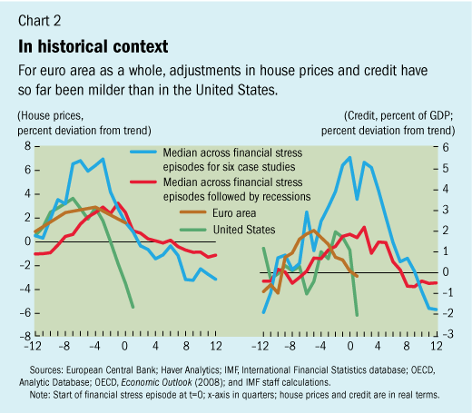 For the euro area as a whole, the adjustment in house prices and credit has thus far been milder than in the United States, although recent evidence indicates the adjustment is gathering momentum. Firms are also starting from a stronger base in terms of their reliance on external financing.
