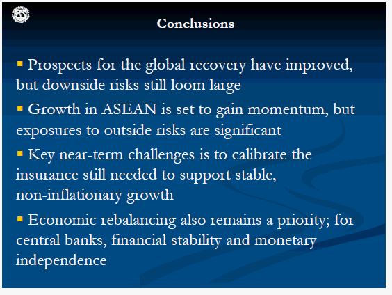 33. In sum, let me say that while prospects for the global recovery have improved in recent weeks, significant risks remain. Growth in ASEAN is also set to regain momentum, but policy makers face difficult challenges as the balance of risks remains highly uncertain. Providing the right amount of insurance in support of stable growth is not only the key near-term challenge. Comprehensive macroeconomic and structural reform policies are needed to bring about lasting economic rebalancing. For central banks, safeguarding financial stability and monetary independence will remain high on the agenda.