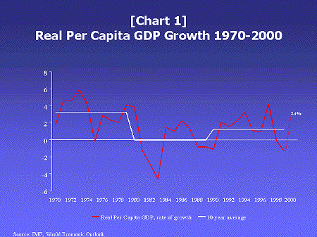 First, growth. In this area, we have an encouraging story to tell. As you can see in Chart 1, the 1990s marked a return of the Region to positive—albeit moderate—annual average per capita growth after stagnation during the 1980s.1 Growth rates peaked at 4 percent in 1997, before dipping during the Asian financial crises and subsequent contagion, and are expected to reach 2.4 percent this year and even higher next year.2 But a word of caution: per capita annual average growth still remains almost two percentage points below the average of the 1970s. Are we unduly encouraged? I think not, for there are other signs that important progress was made during the 1990s.
