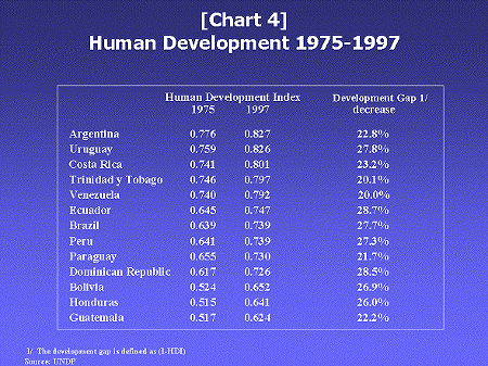 Let us look at the data, keeping in mind the limitations on both data availability and cross-country comparability. A useful guide is the UNDP's Human Development Index (HDI), which tries to measure average achievements in basic human development—including life expectancy, educational attainment, and income—in one single composite index. A country's HDI value shows the distance that that country has traveled towards the maximum possible value of 1. What is the story for the Region? As Chart 4 shows, since 1975, the gap between the optimal index value of 1 and the actual country index values has been reduced by one-fifth or more in all countries for which information was available.