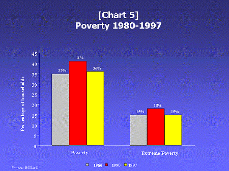 We also see progress on combating poverty. As Chart 5 shows, ECLAC estimates that poverty in the Region rose significantly during the 1980s but has now come back towards the 1980 level. This means that the social cost of the "lost decade" was reversed in the 1990s. Although poverty remains disturbingly high—with almost 185 million people living under the poverty threshold of less than $2 per day—Chile's experience with poverty reduction in the 1990s should encourage us. As Chart 6 shows, poverty can actually be reduced fairly quickly. Chile managed to cut the poverty rate by one half in one decade, thanks to vigorous, sustained growth and well-targeted social policies.