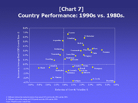 The scatter diagram in Chart 7 depicts the growth performance of 32 countries. The y-axis shows the percentage point increase in the average growth rate that was achieved in the 1990s compared with the 1980s. The x-axis shows the percentage point reduction in GDP growth volatility achieved during the same period.