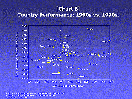 Does this picture change if we compare the performance of the 1990s with that of the 1970s? It is easy to see the difference by comparing Chart 8 with the previous chart. First and foremost, only 9 countries—those located in the two upper quadrants—were able to grow at a higher rate in the 1990s than in the 1970s. Moreover, only six were able to achieve both higher growth and more stability. Trinidad and Tobago managed more stability but growth did fall somewhat on a comparative basis.