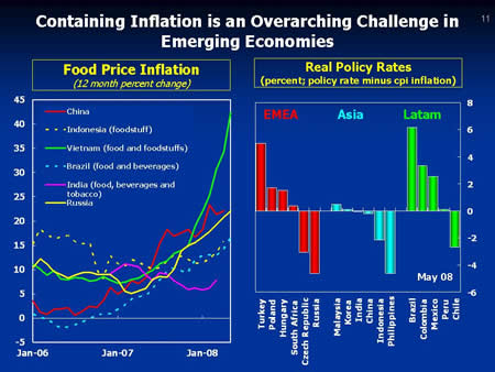 10. In most emerging economies, growing inflation risks are an immediate concern. In fact, real interest rates are low or have become fairly negative in several of these countries. In China, faster appreciation of the renminbi in nominal effective terms would provide more scope for monetary policy tightening to help keep domestic inflation pressures in check. Elsewhere in Asia, countries such as Vietnam, the Philippines and Indonesia appear to have fallen behind the curve in terms of their interest rate policy.