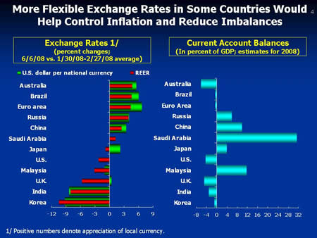 4. Exchange rate movements have also been striking, as the dollar has approached it lowest level in real effective terms since the mid-1990s. The dollar's sustained depreciation has moved it much closer to its medium-term equilibrium value than has been the case in many years. However, recent exchange rate movements have fallen disproportionately on currencies with flexible exchange rate regimes, and may, as a result, be producing new misalignments or fueling protectionist sentiment.