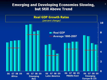 7. In emerging economies, growth is projected to moderate, but remain buoyant in 2008 and 2009.