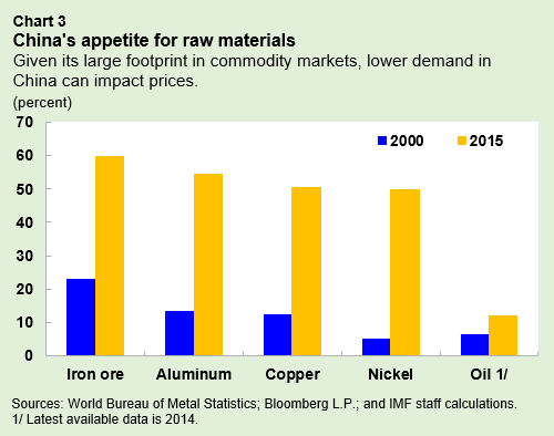 Just as rapid growth in China fostered global growth in the past, the ongoing slowdown and rebalancing toward domestic consumption now also has an impact primarily through three channels. First, through trade (see Charts 1, 2): countries that export machinery and raw materials to China see appetite for their products and commodities fall—this hits Asian suppliers particularly hard. Second, through commodity prices (see Chart 3): due to the country’s large share of global consumption of metals and oil, lower demand can reduce prices. Third, through financial channels: the reaction of asset prices in other countries to events in China can amplify spillovers.