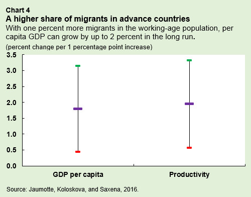 On migration, the study finds that a one percentage point increase in the share of migrants in the adult population could increase the GDP per capita in host countries by about 2 percent in the long run (see Chart 4). It also notes that while high-skilled migrants contribute positively to host economies, lower skilled migrant workers, too, can help raise productivity growth by, for example, allowing high-skilled local women go back to, or spend more time, at work. In the long run, host economies can benefit from migration from both high- and low-skilled workers, concludes the study.