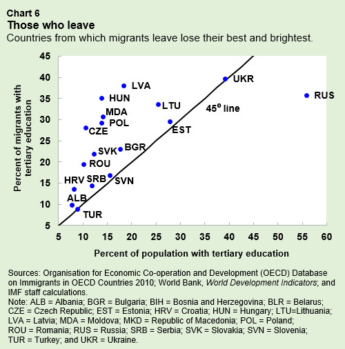 In the countries of origin, the departure of the young and the educated for better economic opportunities can take a toll on long term-growth. The loss of human capital translates into lower productivity, a worsening of skill composition, and dampened tax revenue (see Chart 6). Some of these losses can be mitigated through use of remittances and the use of diaspora networks—but eventually they should tackle the trigger that set their population in motion.