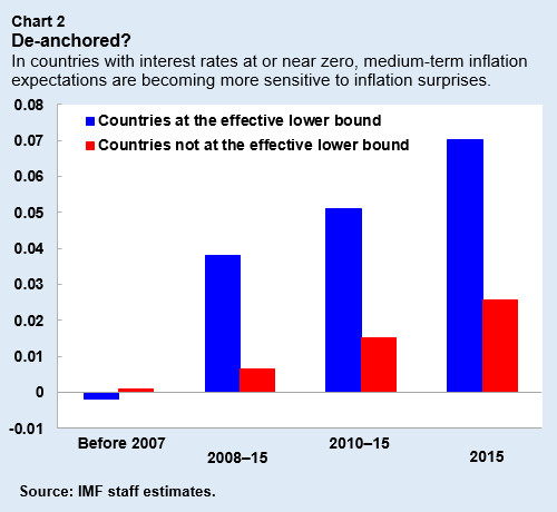 But this is not the whole story. While expectations of the path of future prices, or inflation expectations, have not declined substantially so far, the study finds that the response of inflation expectations to unexpected changes in inflation—an indicator of how well “anchored” inflation expectations are—has increased in countries whose interest rates are close to or below zero.