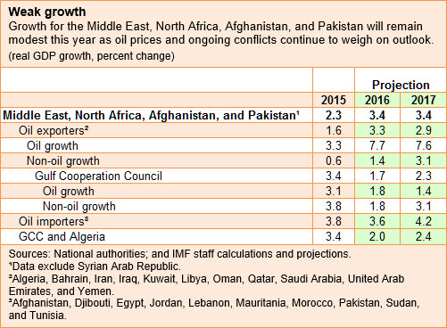 The slump in oil prices and ongoing conflicts continue to weigh on growth prospects of the Middle East, North Africa, Afghanistan and Pakistan, said the IMF in its latest regional assessment.