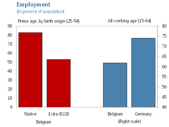 Raising the low employment rates among certain groups would provide a major boost to Belgium’s growth potential. While employment growth has been solid, the labor market remains severely fragmented across regions and skill levels. Many younger and older persons are not working, and non-EU immigrants are even less integrated in the labor market than in other European countries. Only about half of non-EU immigrants aged 25–55 are employed, compared to over 80 percent for Belgian-born residents. Four broad priorities stand out: (i) preserving the gains from wage moderation by linking wage growth to broader labor market and economic conditions (supported by a reform of the 1996 law on employment and competitiveness); (ii) further reducing the labor tax wedge; (iii) improving education and on-the-job training, in particular given the need for competency in multiple languages and unmet demand for certain technical skills; and (iv) addressing barriers to geographical mobility, including traffic congestion, gaps in the public transport network, and the high house transactions tax.