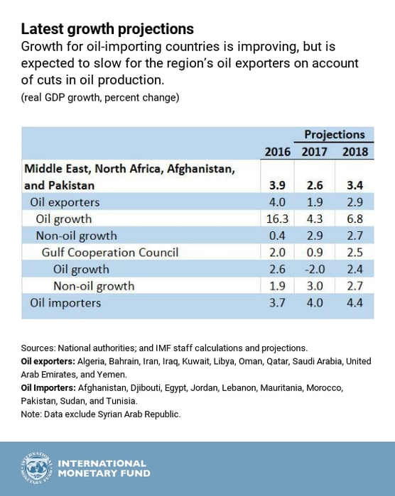 “However, our projections indicate that growth will be too low to create enough jobs or improve living standards. Many countries—especially oil importers—are also carrying high levels of debt.” Both oil exporters and importers are therefore “facing two critical policy imperatives: fiscal consolidation and structural reforms,” he emphasized.