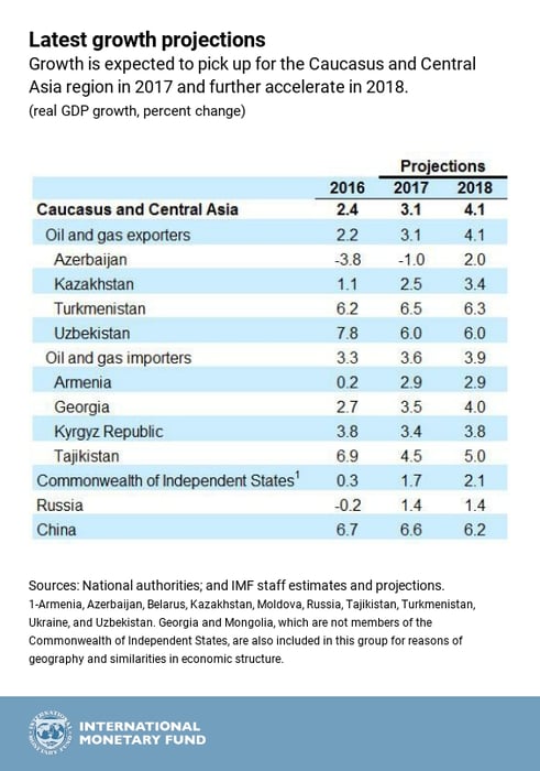 Growth in the Caucasus and Central Asia is expected to pick up this year to 3.1 percent from 2.4 percent in 2016 as the external environment improves—firmer growth in Russia, an upgraded outlook for China, and a partial recovery in commodity prices, says the IMF’s latest regional forecast.