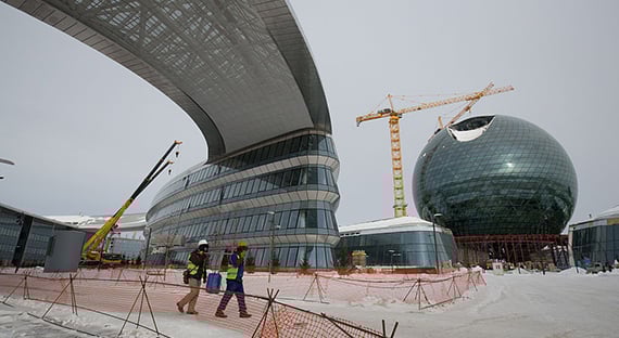 Construction workers walk past the Astana Expo 2017 Sphere in Astana, Kazakhstan. Economic activity is picking up in the country, says the IMF's report (photo: Andrey Rudakov/Bloomberg via Getty Images)