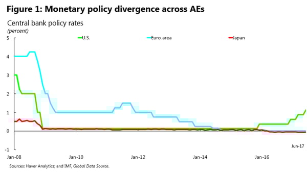 For the major advanced economies, much of the decade has been spent in lacklustre growth with periods of worrisome deflationary pressures. Central bank responses included ultra-low and even negative nominal interest rates, as well as unconventional balance sheet and lending policies. The Fed emerged from years at the zero interest-rate bound only in December 2015 and has slowly carried out three subsequent rate hikes in its drive to “normalize” monetary policy. In the euro zone the balance of sentiment on the ECB board seems to be shifting toward tightening, although core inflation remains below the 2% target. And the Bank of Japan remains solidly committed to an unconventional package, including pegging the 10-year bond rate at zero, in the face of persistently very low inflation. Figure 1 illustrates trends in policy interest rates.