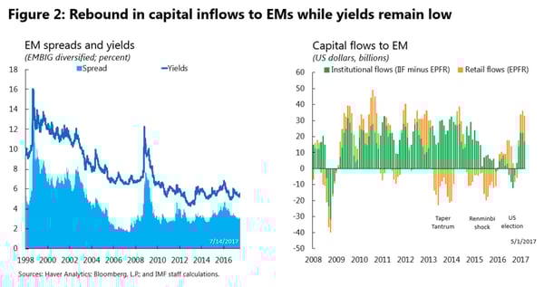 In the face of these cross-currents, it was difficult for synchronized global growth to take hold. But now, we can cautiously identify signs that this may be changing. In our April World Economic Outlook , we noted that the world economy seemed to be gaining momentum after a disappointing first half of 2016 with broadly-based improvements in soft indicators – including consumer confidence and manufacturing PMIs – as well as hard indicators relating to investment, trade, and manufacturing. For the first time in a while, the Fund was able to raise its global growth projections – which in April we placed at 3.5% for 2017 and 3.6% in 2018. Capital inflows have returned to emerging markets, and borrowing spreads are compressed (Figure 2).