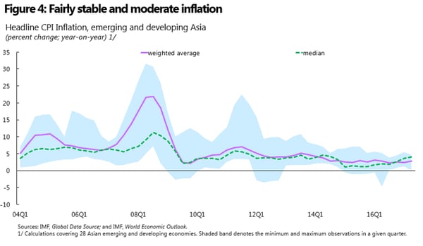 Monetary policy can enhance macroeconomic stability, though, and one of the key ways it does so is by anchoring inflation expectations at moderate levels. To be perfectly candid, while the question of “What Lies Beyond Price Stability?” is vitally important – and I will turn to that in a minute – the question of “What Lies Behind Price Stability?” is one that is not as well understood as some economists might pretend. Pure fiat money depends for its value on being broadly acceptable in exchange for goods and services – which requires, in turn, that people have confidence in its value. In other words, money derives its value from a network externality, such that my opinion of money’s value depends on everyone else’s. That’s why central banks that wish to target inflation successfully must establish track records of credibility by consistently producing inflation near target, and why credibility, once lost, can be so hard to restore. In that respect, the transition over the last two decades in this region, and in emerging markets more generally, from exchange-rate determined monetary policies toward monetary policies more oriented to price stability, has produced fairly stable and moderate inflation – on average in developing and emerging Asia, our April WEO forecast was for somewhat over 3% inflation, though this average conceals variation between higher inflation countries such as India and lower inflation in countries such as Thailand. See Figure 4 on inflation experience since the mid-2000s.