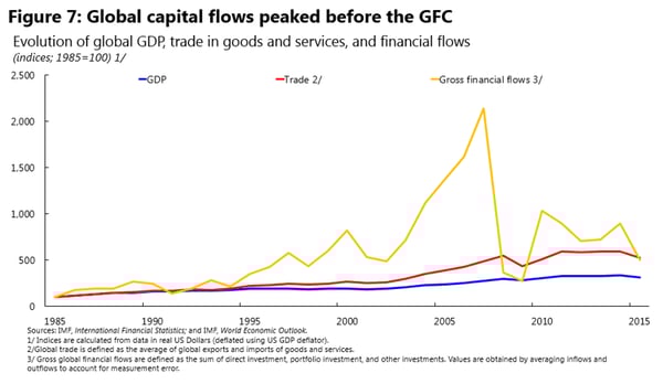 But the Bretton Woods arrangements, as originally conceived, presupposed a world in which international capital mobility would remain restricted (as it was in 1946 when the IMF opened its doors) or at least tightly controlled, and in which domestic financial markets were also subject to intense government regulation and even repression. In such a world, questions of finance and financial stability – and their relationship with the system of international monetary exchange – were pushed to the background. This perspective became increasingly outdated, however, as growing world trade brought with it growing capital mobility (helping to undermine fixed but adjustable exchange rates), and in which governments, for various reasons, at various speeds, and with varying sequencing, dismantled both internal and external financial restrictions. By the eve of the GFC, global capital flows had reached very high levels (see Figure 7), with the rapid growth and elevated volume of these flows arguably signalling stability risks.