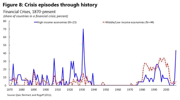 Indeed, a broader reading of history would have recognized that financial instability has been a key feature of the international monetary system since time immemorial. Gold standard writers such as Thornton and Bagehot wrote on the interplay between foreign exchange intervention and the central bank’s lender of last resort role, a theme very much evident in recent crises. The early Great Depression was marked by multiple banking crises, creating powerful currency speculation. In this perspective, the early post-World War II period, with its relatively tight restrictions on financial activity, gave us only a temporary breather (see Figure 8).